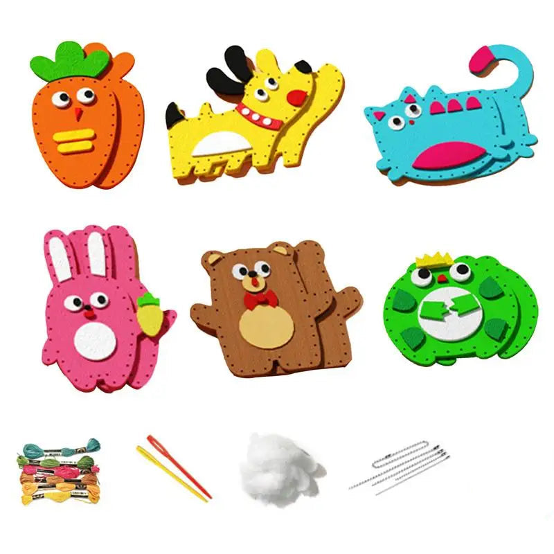6 personagens em feltro para costurar: sapo, cenoura, gato, cachorro, coelho e urso