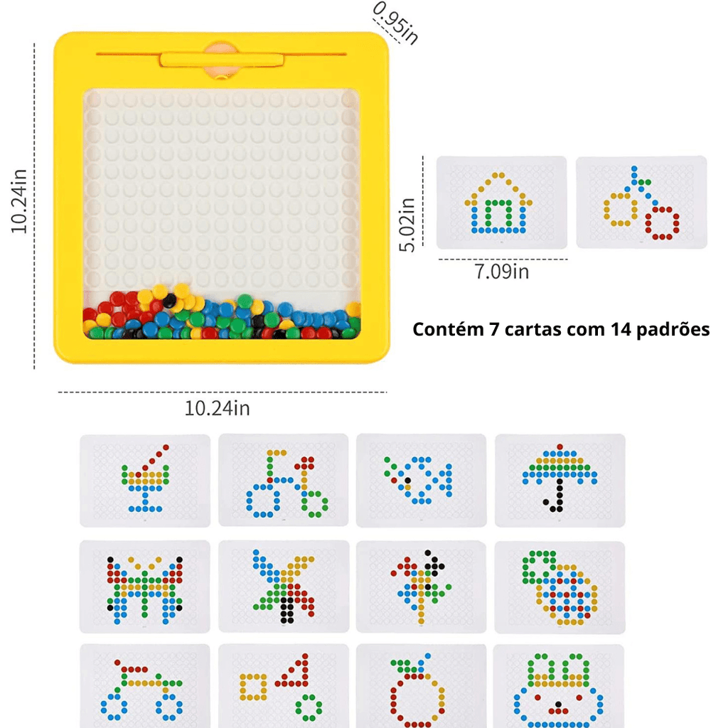 Conteúdo da embalagem: 1 prancheta magnética + 7 cartas com 14 desenhos.